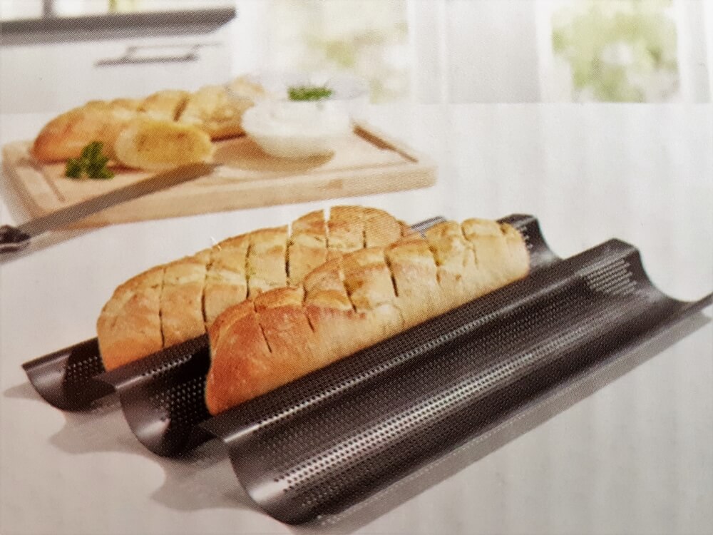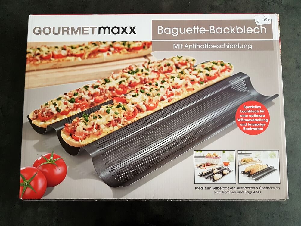 Knusprige Baguettes schön und gut, aber über 30 Euro für ein einfaches Blech, dass wie eine Regenrinne aussieht? Ganz sicher nicht! Tja, einige Monate später und versteckt in der hintersten Ecke haben wir genau so ein Blech für sage und schreibe 9,99 Euro gefunden. Manchmal lohnt es sich etwas geduldig zu sein.